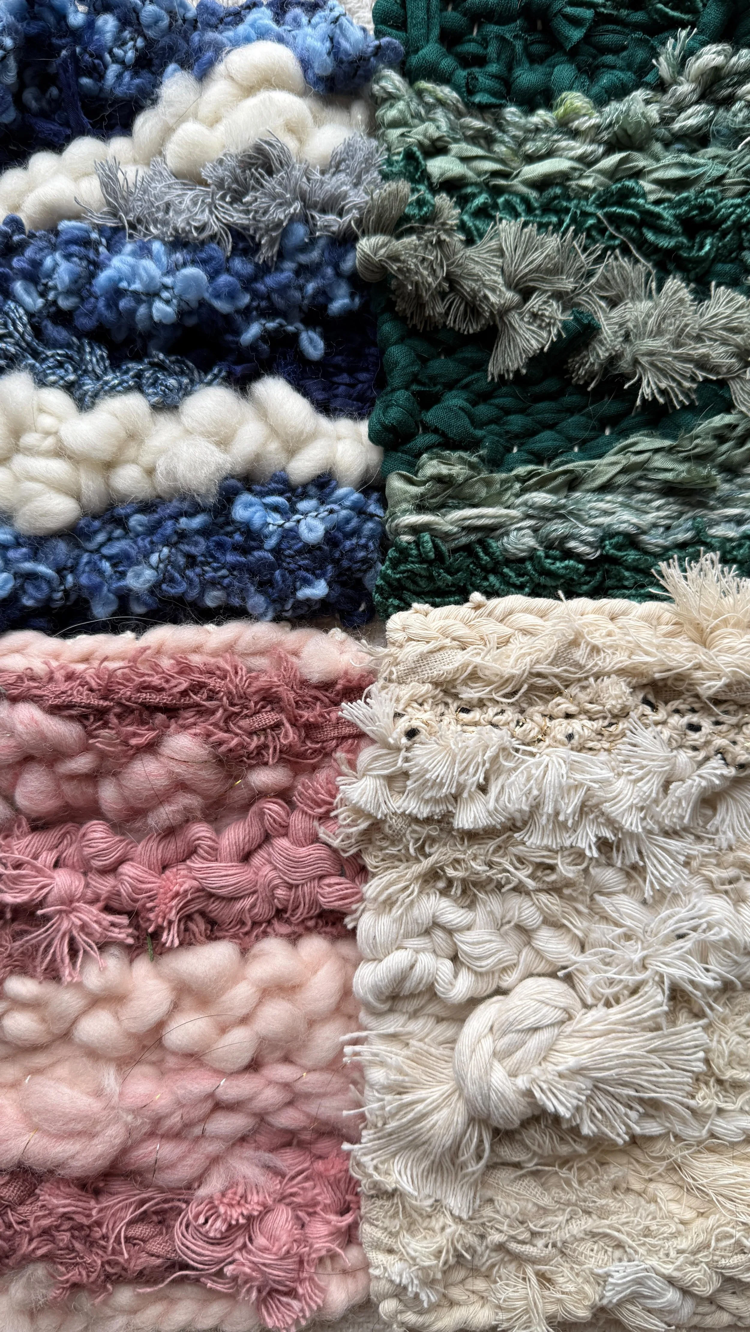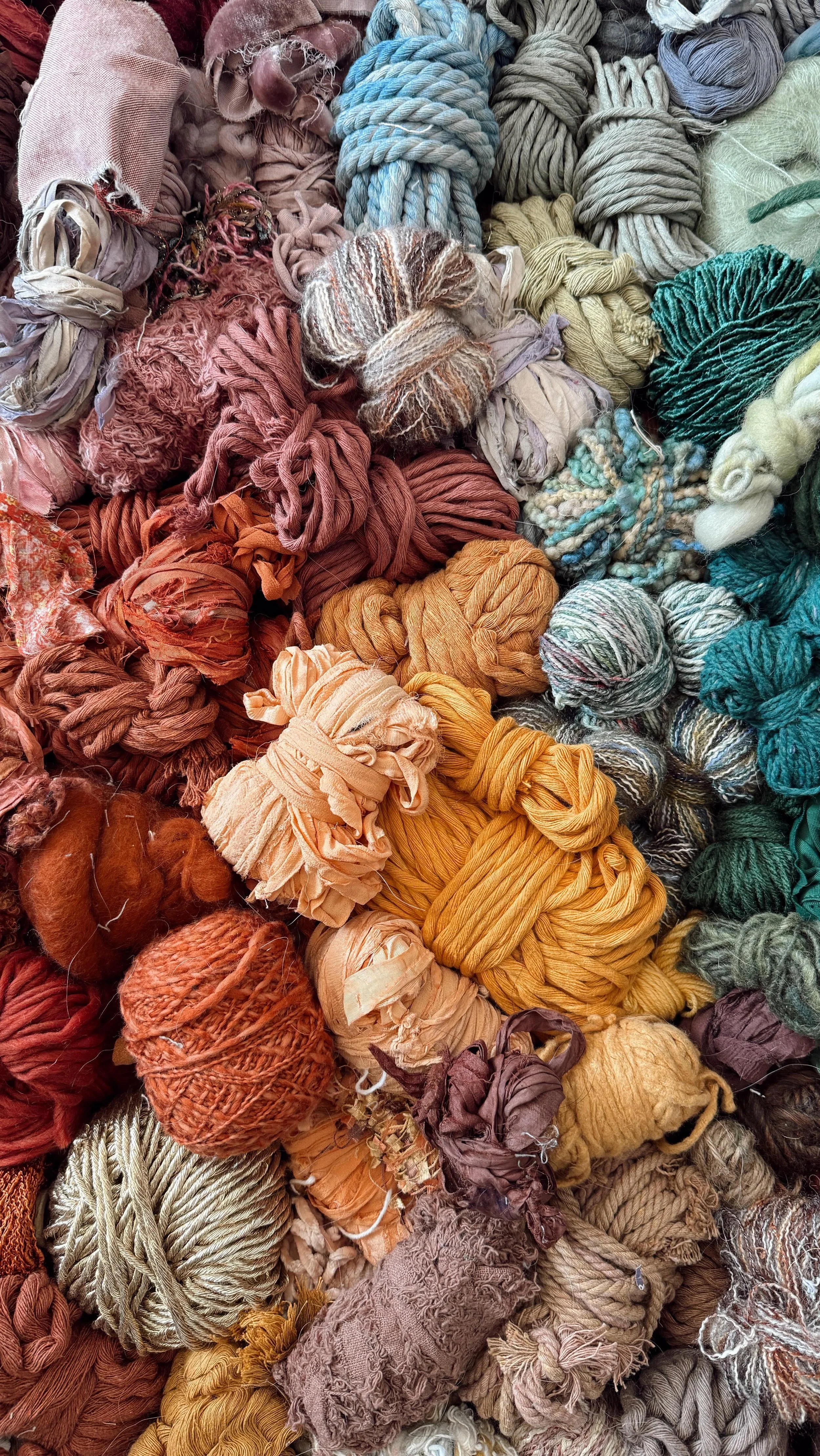 Each piece is handwoven with diverse fibers that embody sustainability and nostalgia. Sari silk, handspun art yarn, chiffon ribbon, recycled cotton cord, torn velvet, vintage yarn, locally dyed wool, upcycled fabric and more.