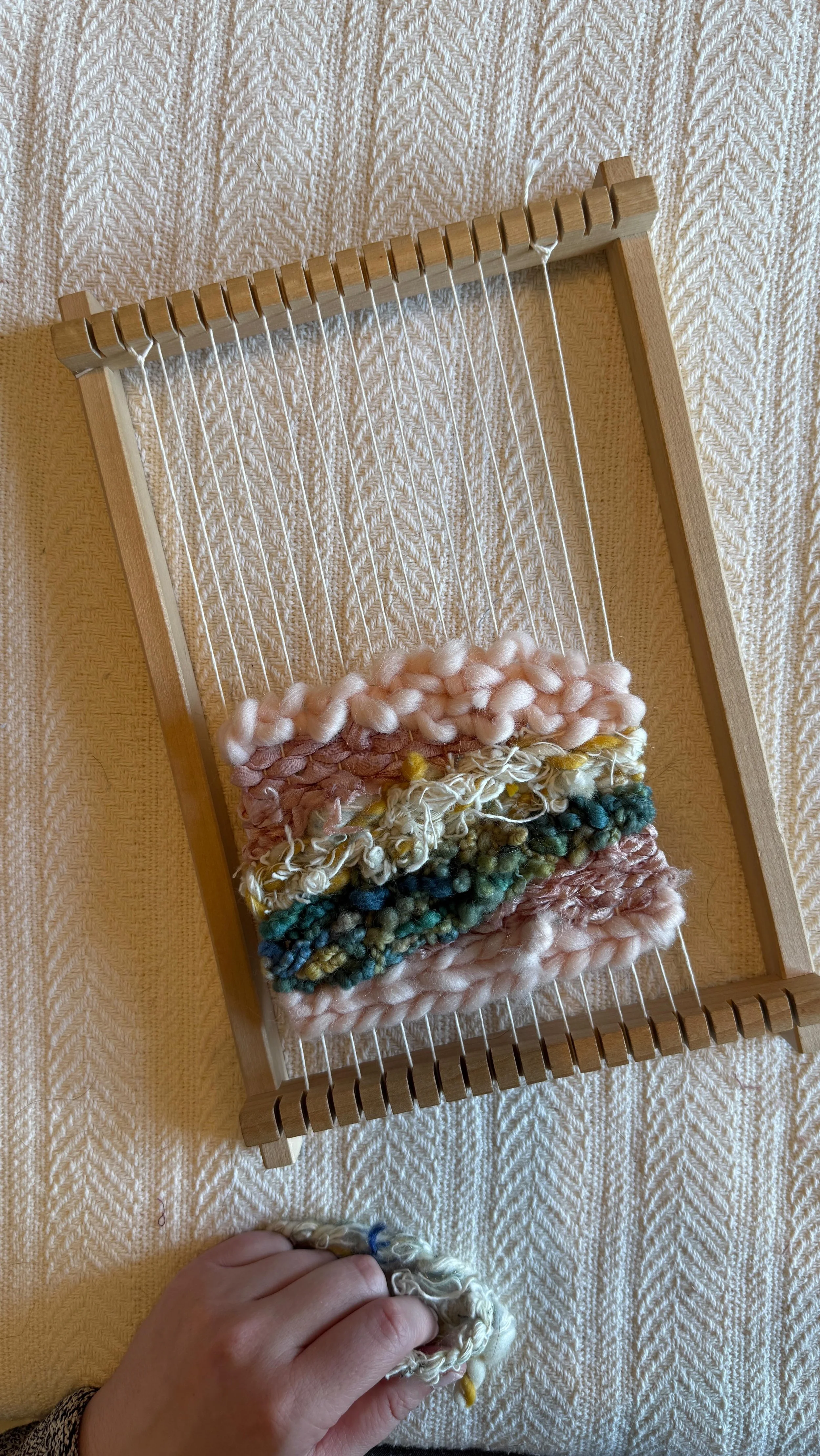 I offer custom work on keepsake ornaments, round weavings and more — all the way up to 6 feet wide statement tapestries!