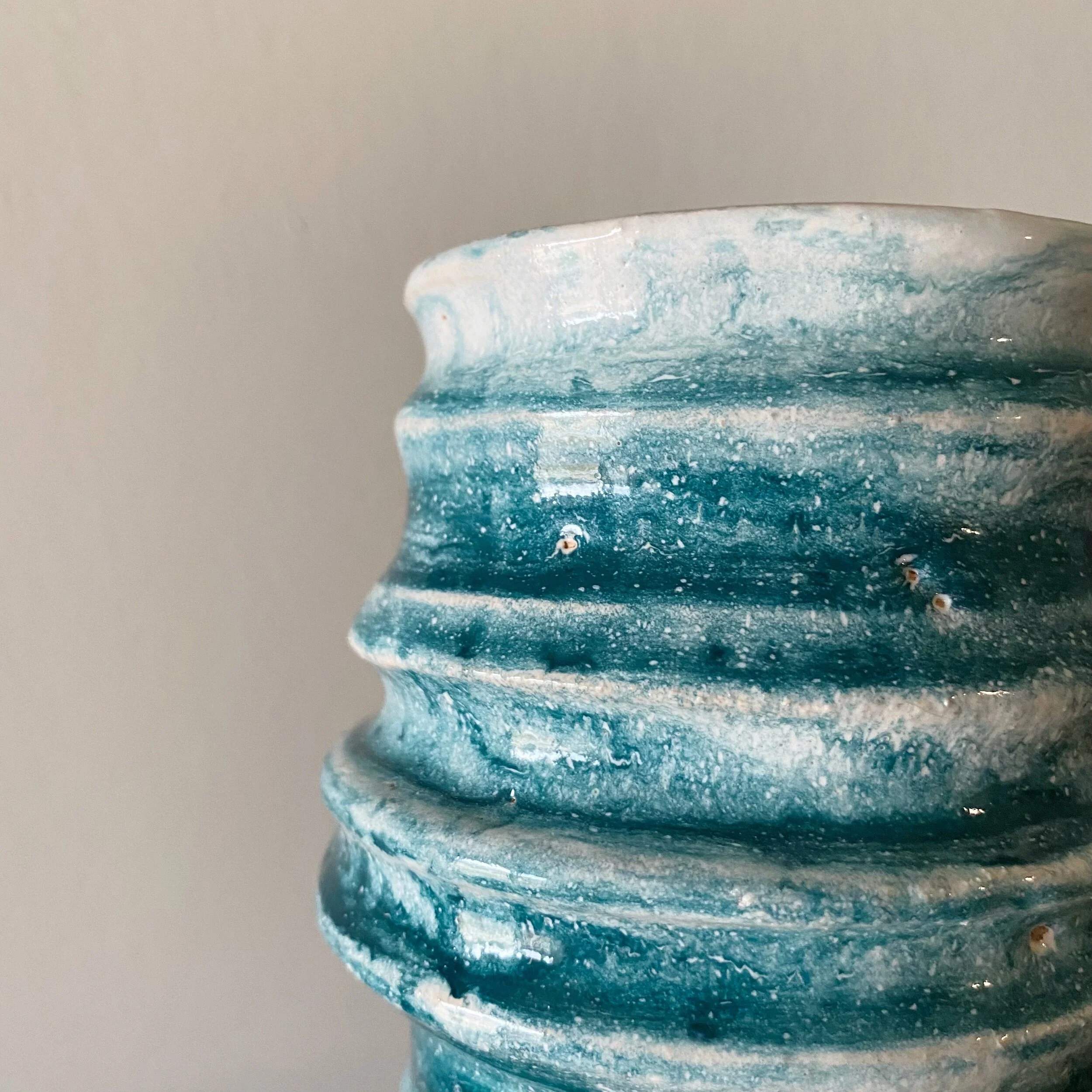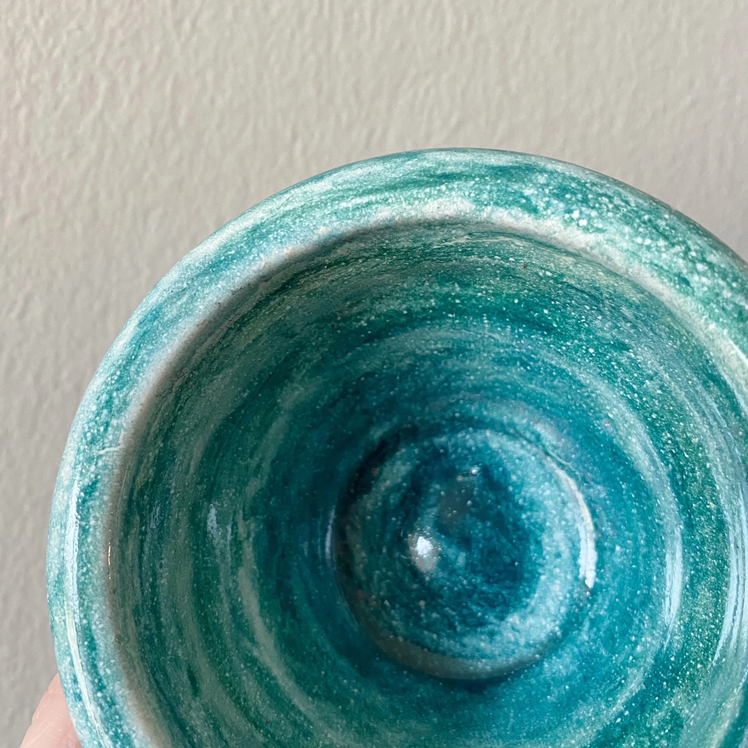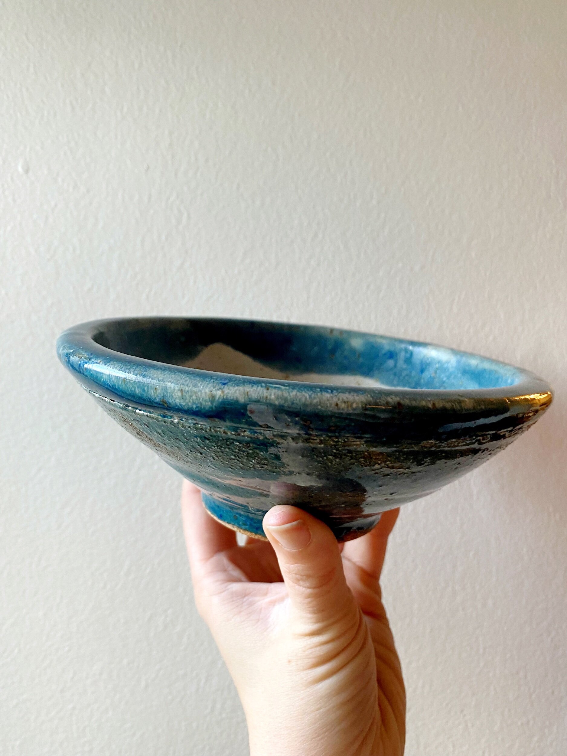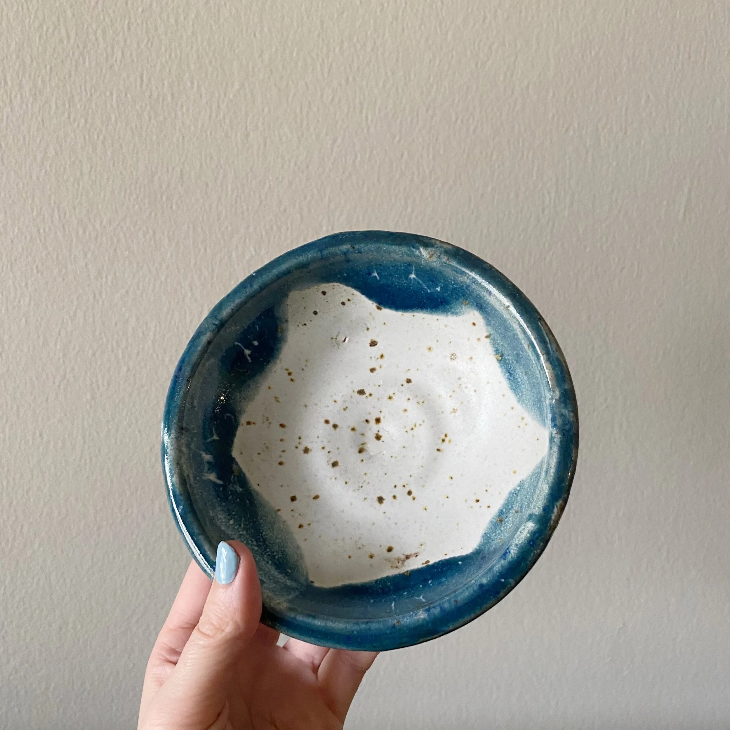This blue and white speckled bowl was thrown on a pottery wheel, one of four— alike but different. Could be used as a trinket bowl or to hold small things! For decoration only — not food safe.